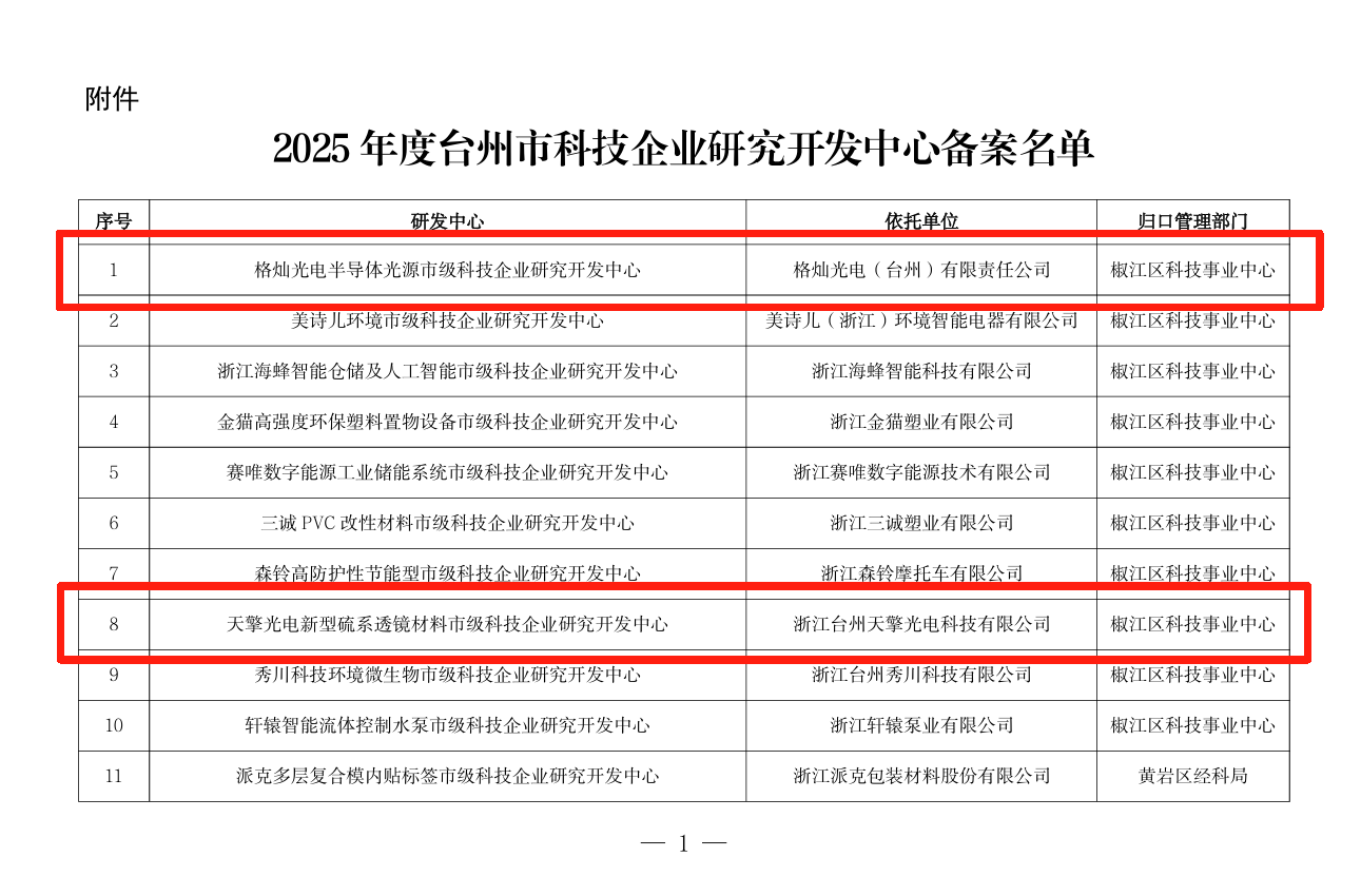 近日,台州市科学技术局发布了《台州市科学技术局关于组织申报2025年度市级高新技术企业研究开发中心的通知》。其中,台州光电产业加速器入驻企业格灿光电(台州)有限责任公司和浙江台州天擎光电科技有限公司成功入选。