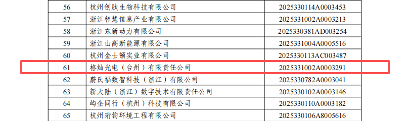 近日,浙江省经济和信息化厅发布关于2025年第三批入库科技型中小企业的通告,台州光电产业加速器入驻企业格灿光电(台州)有限责任公司入库。